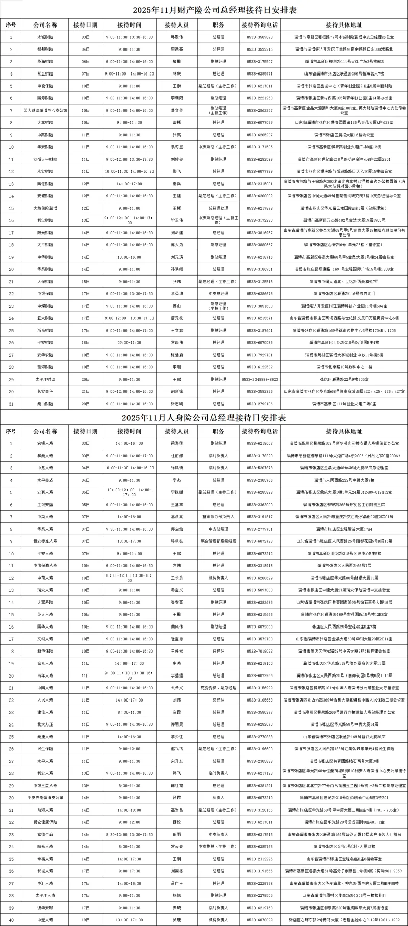 为进一步畅通信访投诉渠道,广泛听取保险消费者的诉求和意见,切实保护广大保险消费者的合法权益。根据国家金融监督管理总局山东监管局的相关要求,现将2025年11月淄博市保险公司总经理接待日安排表公告如下: