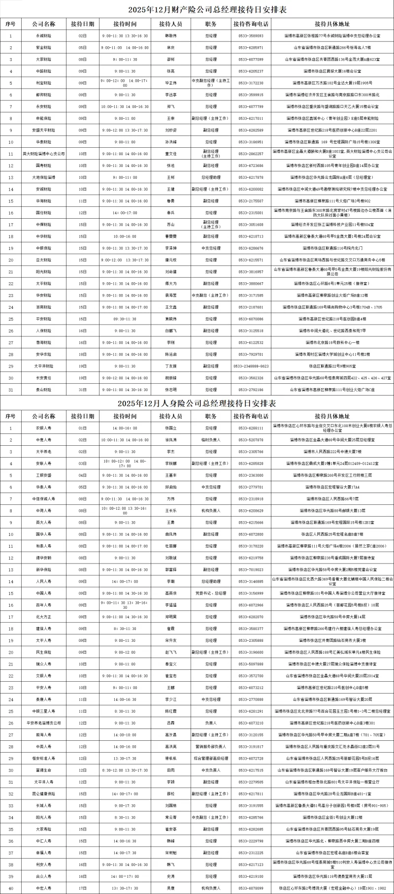 2025年12月份淄博市保险机构总经理接待日安排表