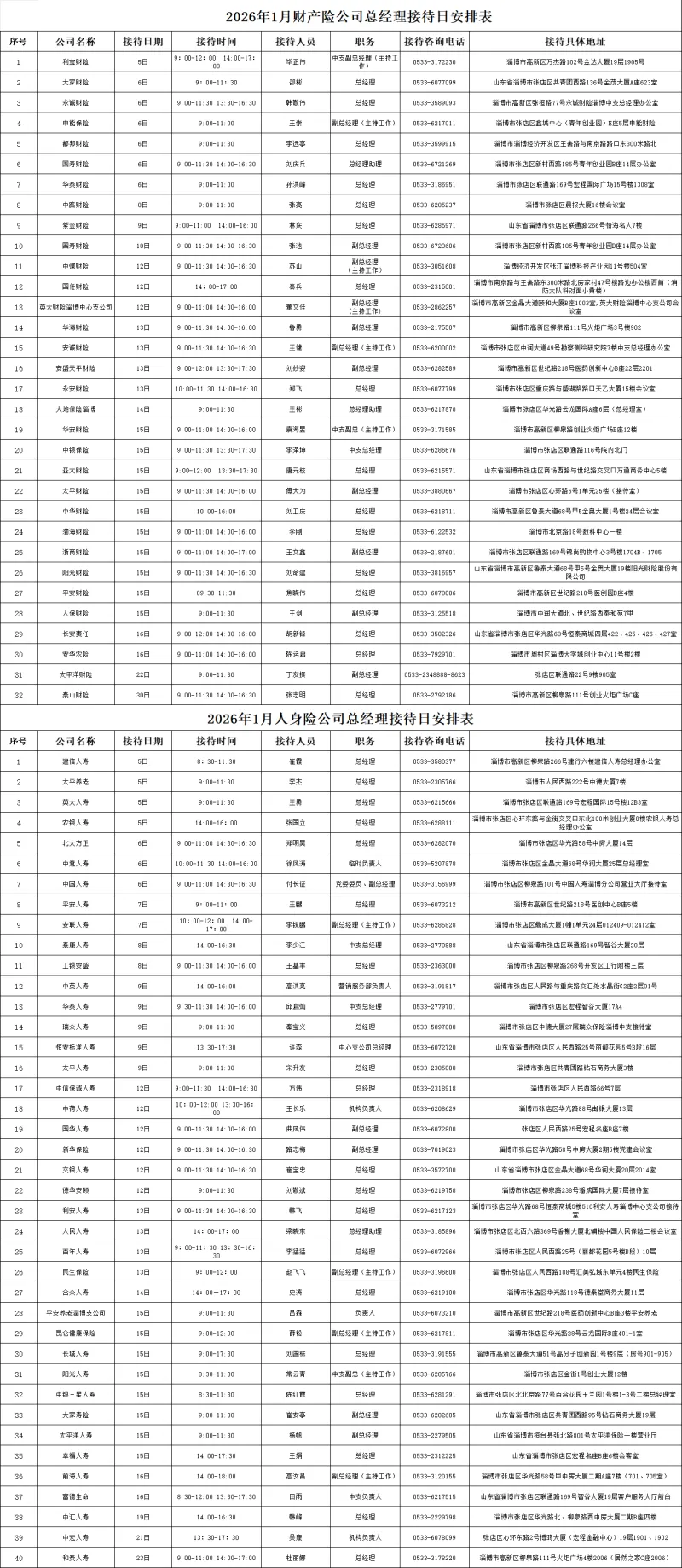 2026年1月份淄博市保险机构总经理接待日安排表