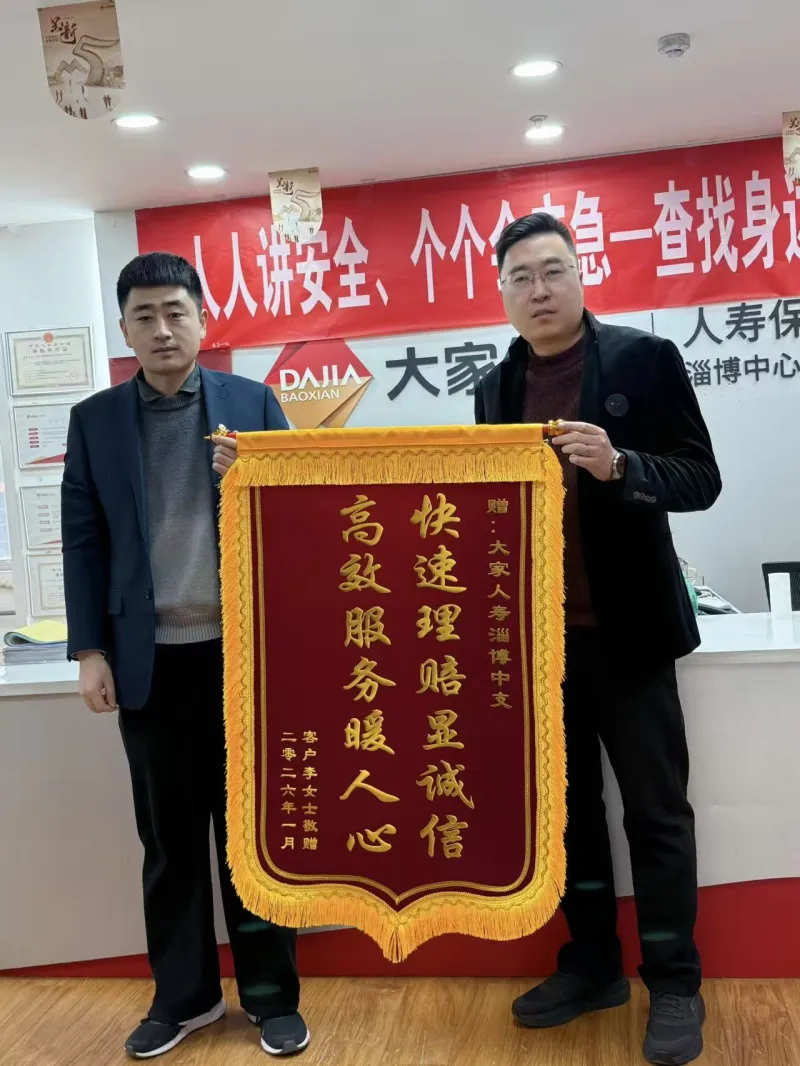 新年伊始,大家人寿淄博中支及时兑现336万高额身故理赔金,客户赠送印有“快速理赔显诚信,高效服务暖人心”的锦旗,这不仅体现了保单对家庭风险的保障作用,也彰显了保险行业的责任担当。
