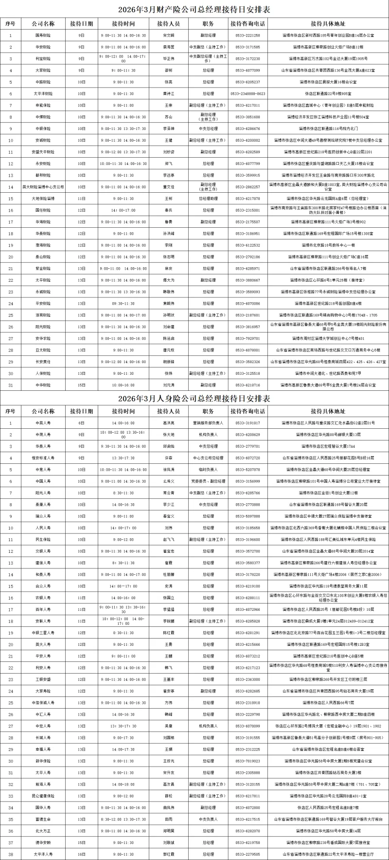 2026年3月淄博市保险公司总经理接待日安排表